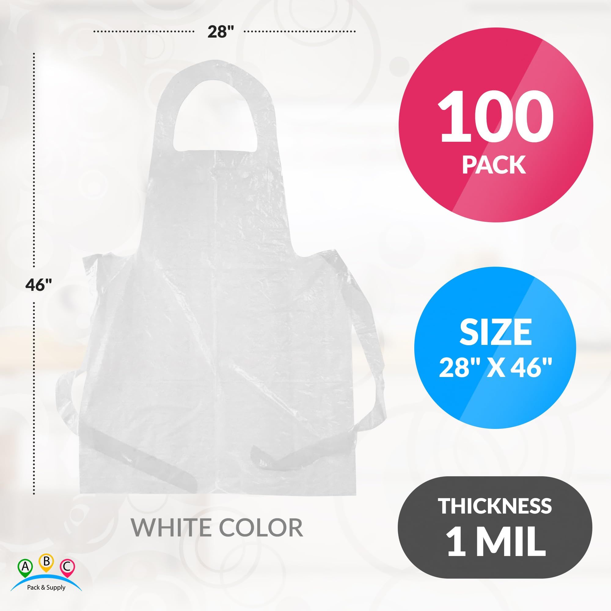 1.100 pack of white plastic aprons for women and men 28 x 46 inch. Hassle-free protection with easy-to-use plastic apron. Disposable apron is simple to put on and take off. Compact design ensures disposable plastic apron is easy to store, ensuring you always have protection on hand.