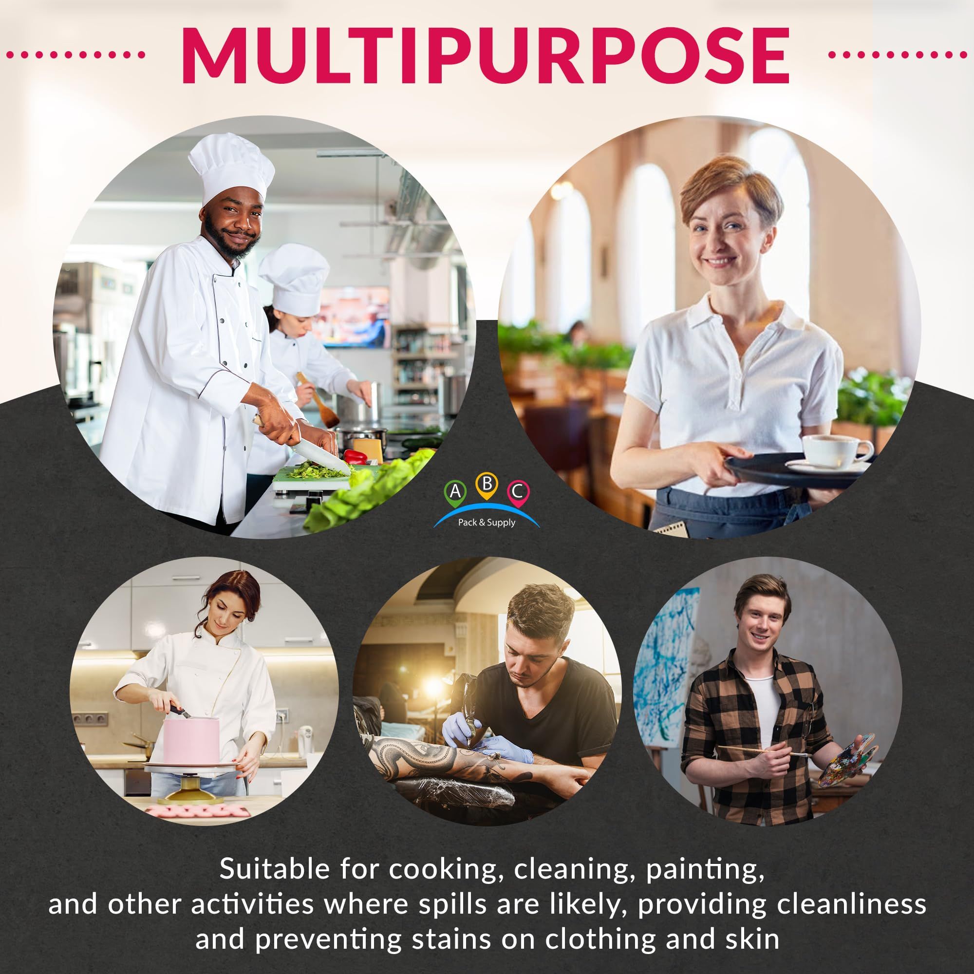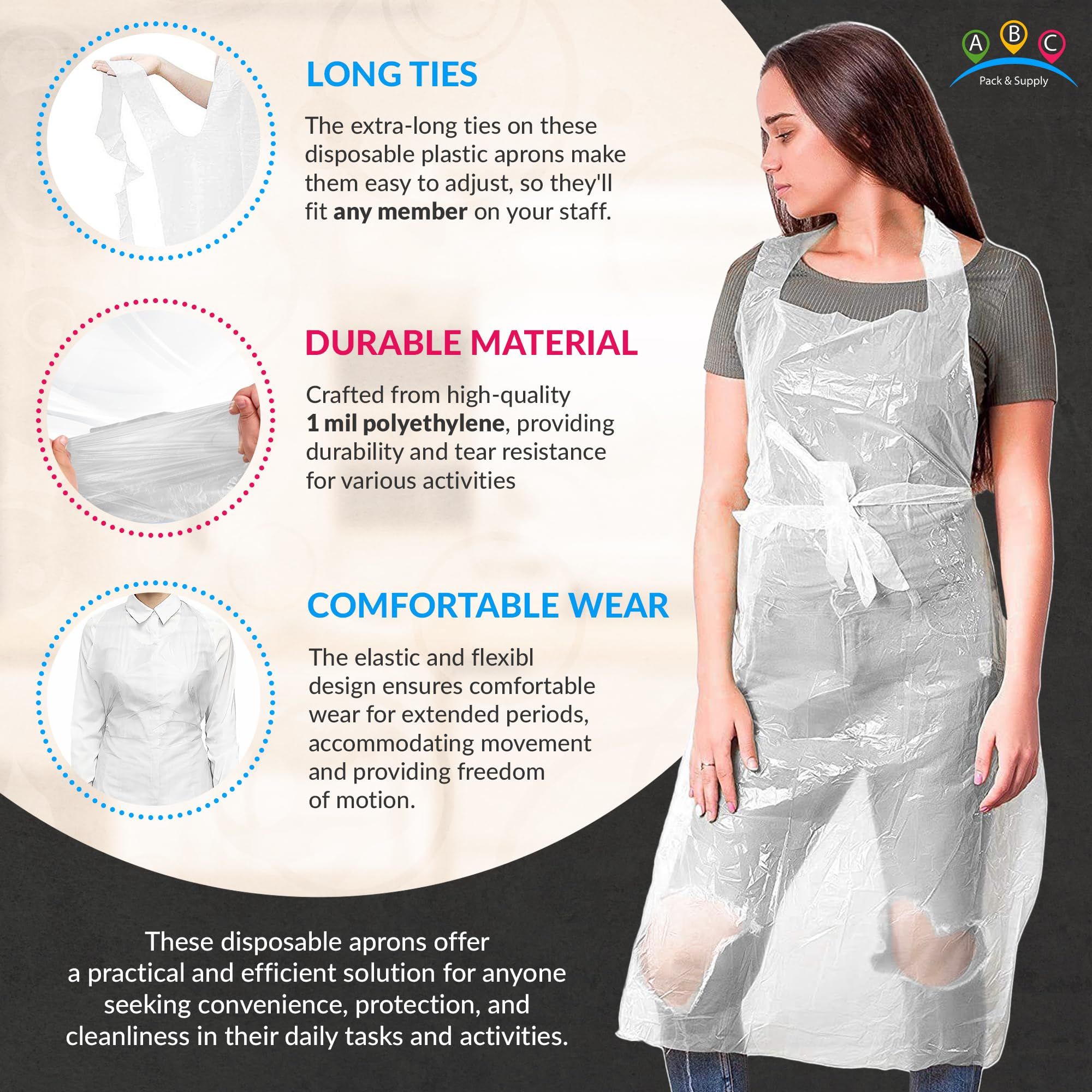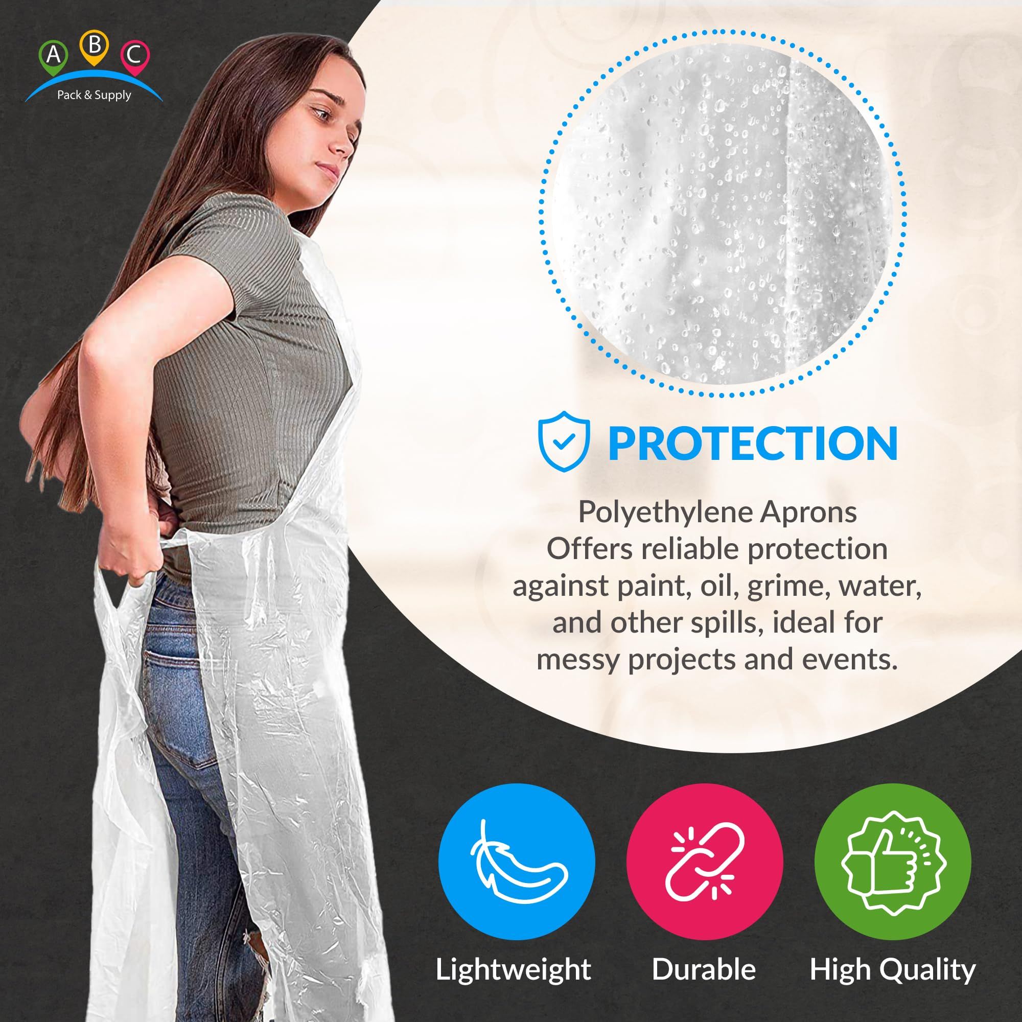 2.Durable and robust. Crafted from high-quality 1 mil polyethylene, disposable lab aprons offer durability and tear resistance. Designed to withstand wide range of activities, adult disposable aprons are ideal for cooking, cleaning, washing dishes, etc.